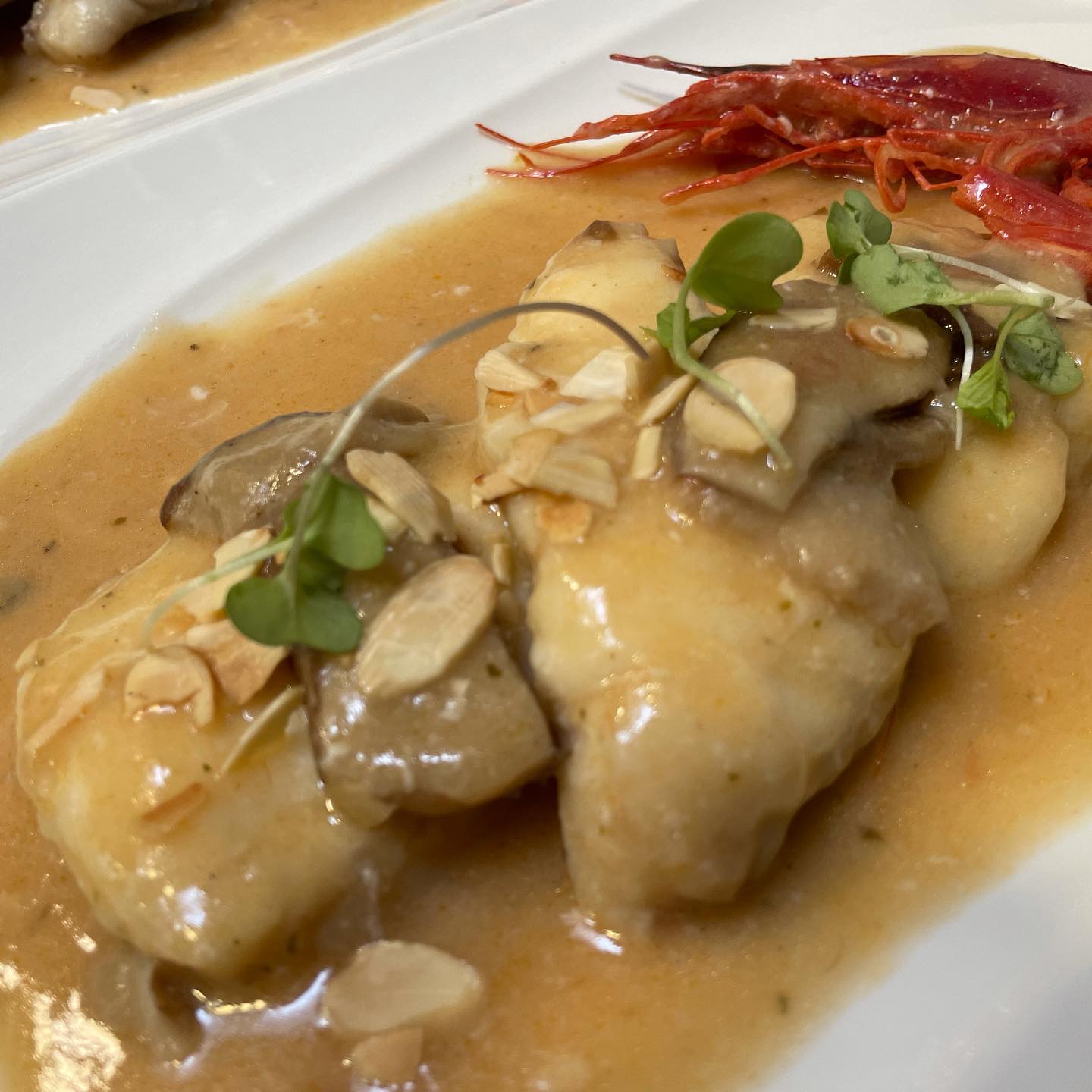 Lomos de rape en salsa de boletus y langostinos